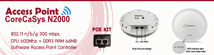 | Corecasys Access Point รุ่น N2000 เป็น Access Point ที่เหมาะสำหรับการใช้งานภายในสำนักงาน หรือบ้านพักที่ต้องการเสถียรภาพของ Access Point เป็นหลัก เนื่องจากอุปกรณ์รองรับเครื่องลูกข่ายได้เป็นปริมาณมาก (CPU 600Mhz + DDR3 RAM 64MB) และมี Modular ของเสาอากาศแยกออกจากแผงวงจรหลัก (SKY65174) ซึ่งปัจจุบัน Access Point ที่ขายกันอยู่ทั่วไป แทบจะไม่มีรุ่นไหนที่แยก Modular Chipset ของเสาอากาศออกจากแผงวงจรหลักเลย ดังนั้นทำให้ Corecasys Access Point รุ่น N2000 รับส่งข้อมูลได้อย่างมีประสิทธิภาพ และมีเสถียรภาพ อีกทั้งยังมีฟรีโปรแกรม “Software Access Point Controller” ซึ่งช่วยให้จัดการกับ Access Point หลายสิบ หรือหลายร้อยตัวได้พร้อมกัน ด้วยการสั่งผ่านโปรแกรมเพียงครั้งเดียว อุปกรณ์ Corecasys Access Point รุ่น N2000 มาพร้อมกับ PoE Kit คุณจึงไม่ต้องเดินปลั๊กไฟสำหรับ Access Point ให้วุ่นวายอีกต่อไป |