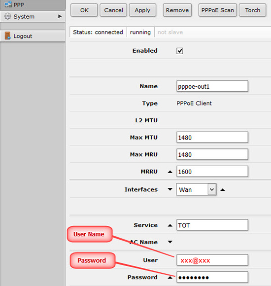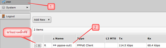 คลิ๊กที่เมนู PPP แล้วคลิ๊กที่คอลัมน์ Name ตรงชื่อ pppoe-out1 |