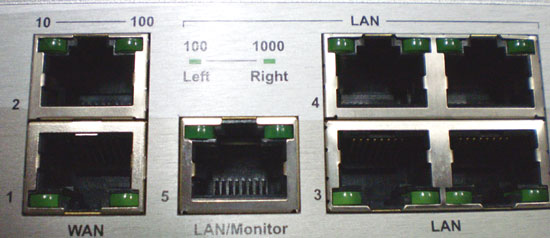 ด้านหน้าเครื่องมี 4 LAN Port Switch 10/100/1000 และ 2 WAN Port 10/100 ในส่วนของ Lan Monitor Port นั้นใช้ควบคู่กับโปรแกรม Smart Monitor ซึ่งจะช่วยดักจับข้อมูลภายในองค์กรได้อย่างมีประสิทธิภาพ
