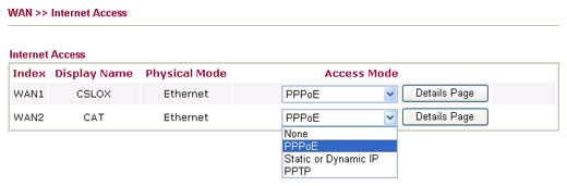 WAN Interface ของ Vigor 2950 รองรับการเชื่อมต่อแบบ RJ45 ที่มาจาก Leased Line, ADSL. G.Shdsl จึงทำให้ยืดหยุ่นมากในการใช้งาน โดยทั่วไปแล้ว หากต้องการให้ Public IP ของ ISP มาอยู่ที่ขา WAN ของ Vigor 2950 นั้น โดยทั่วไปจะใช้ Mode PPPoE เชื่อมต่อไปยัง Modem Bridge ซึ่งอยู่ด้านหน้า แต่หากต้องการเชื่อมต่อเข้ากับ Leased Line ที่มี Interface ออกมาเป็น RJ45 ก็จะใช้ Static or Dynamic IP โดย IP ที่เหลือจาก Leased Line นั้นสามารถทำ IP Alias ไปยัง IP ภายในได้อีก 32 Public IP