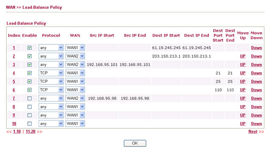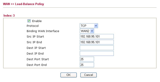 พระเอกของฟังก์ชั่นโหลด Balance อยู่ตรงจุดนี้ Vigor 2950 กำหนด Wan ขาออกของเครื่องลูกข่ายแต่ละเครื่องได้ทั้งแบบ IP Address และแบบ Port ตัวอย่างจากภาพที่ 8 เช่น IP 192.168.95.101 ให้ออกเน็ตผ่าน WAN 2 อย่างเดียว หรือจะให้ Application ในการส่งเมล์เช่น SMTP (Port 25), FTP (Port 21) และ POP3 (Port 110) ส่งออกผ่าน WAN 1 อย่างเดียวก็ได้ ซึ่ง Load Balance ในท้องตลาดหลายยี่ห้อมีปัญหาตรงจุดนี้กันมาก ซึ่งหากใช้ Internet ของ ISP ที่ต่างกัน เช่น WAN1=INET และ WAN2=True ทั้ง 2 ISP นี้จะใช้ SMTP ในการส่งข้อมูลต่างกัน ดังนั้นหากกำหนดให้ Port 25 ส่งออกผ่าน WAN ใด WAN หนึ่ง ปัญหาในการส่งเมล์ก็จะไม่เกิดขึ้น
