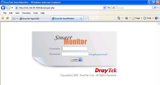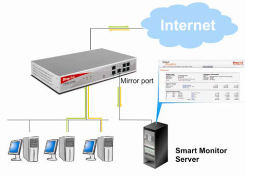 ช่อง LAN Monitor Port ที่มีมาให้กับ Vigor 2950 นั้น เป็นช่องที่รองรับเทคโนโลยี Mirror Port โดยโปรแกรม Smart Monitor นั้นจะใช้เทคโนโลยีการ Sniffer ดักจับ Package ทุกอย่างที่วิ่งผ่านเข้า-ออก จาก Wan ทั้ง 2 ขา โดยเทคโนโลยีการ Sniffer นี้ จะสามารถดักจับได้ถึงเนื้อในของ Service ต่างๆ ได้อีกด้วย วิธีการใช้ก็ง่ายมาก เพียงแค่จัดเตรียมเครื่องคอมพิวเตอร์ 1 เครื่อง Spec ขั้นต่ำประมาณ P4, RAM 2 GB และ HDD 500 GB, Windows XP หรือ 2003 จากนั้นก็ลงโปรแกรม Smart Monitor ไปที่คอมพิวเตอร์เครื่องนั้น แล้วเสียบเข้าไปที่ช่อง Lan Monitor Port