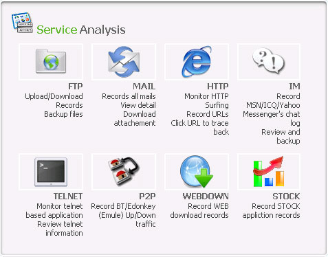 โปรแกรม Smart Monitor สามารถดักจับข้อมูลภายใน Service ต่างๆ เหล่านี้ ได้แก่ FTP, Mail (POP3/SMTP), HTTP, IM (MSN Messenger, ICQ, Yahoo Messenger), Telnet, P2P (Bit Torrent / U-Torrent / Bit Comet) การใช้งานก็แสนง่ายดาย เพียงแค่เปิด Internet Explorer แล้ว Browser เข้าไปยังเครื่องที่ลงโปรแกรม Smart Monitor ไว้แล้วเท่านั้น ซึ่งในการเข้าดูข้อมูลของโปรแกรม Smart Monitor นั้น สามารถกำหนดสิทธิ์ผู้เข้าดูได้ว่า สามารถอ่านข้อมูลประเภทใดได้บ้าง เช่น User A อาจเข้าดู Content เฉพาะส่วนที่เป็น HTTP ได้อย่างเดียว ส่วน User B สามารถดูได้ทั้งหมดเป็นต้น