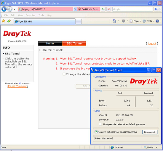 สำหรับการเชื่อมต่อแบบ SSL VPN นั้น ก็แสนง่ายดาย เพียงแค่ท่านเปิด Web Browser ขึ้นมา พิมพ์ https:// ตามด้วย Public IP หรือ Dynamic DNS ของ Router จากนั้นติดตั้ง Java ตามที่ Web Browser ร้องขอมา เพียงเท่านี้ท่านก็สามารถเชื่อมโยงเครือข่ายเข้าสู่สำนักงานใหญ่ผ่าน SSL VPN ได้แล้ว