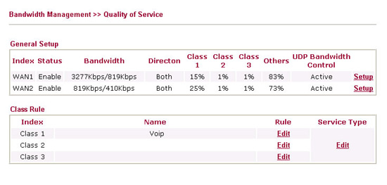 พื้นฐานของเทคโนโลยีที่จะใช้งาน VOIP ได้อย่างมีประสิทธิภาพนั้น จะต้องมี QOS ที่ทำงานได้อย่างแท้จริง โดย QOS ของ Vigor 2950 นั้น มี User Interface ที่สวยงามกว่า ซึ่งสามารถดูกราฟการทำงานได้จริงแบบ Realtime หากระบบเครือข่ายของท่าน ต้องการการ Guarantee Service ใด Service หนึ่งเป็นพิเศษ เช่น อยากกัน Service ของ VOIP เอาไว้ที่ 25% ของ Bandwidth ทั้งหมด ก็สามารถทำได้อย่างง่ายดาย ทั้งนี้ QOS ของ Vigor ตระกูล 2000 Series สามารถทำ QOS ได้ทั้งแบบ Service (Port) และ IP