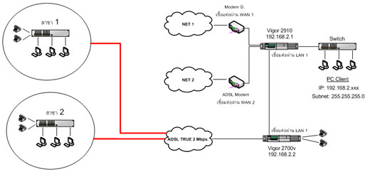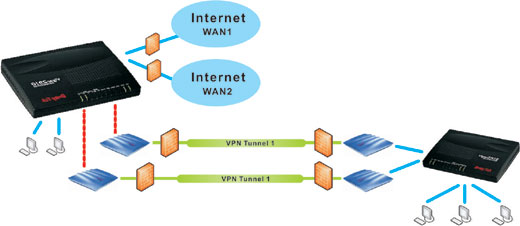ในส่วนของการทำงานแบบ VPN Load Balance นั้น เมื่อก่อน ท่านอาจต้องใช้ Vigor 2700 ขวางด้านหน้า Vigor 2950 เพื่อให้ VPN ทั้ง 2 เส้นทำงานพร้อมกันเป็นคู่ขนาน แต่ด้วย Function ใหม่ล่าสุดของ Vigor 2950 นั้นสามารถทำ VPN 2 Tunnel เชื่อมต่อไปยังจุดหมายปลายทางเดียวกันได้เลย โดยไม่ต้องมี Vigor 2700 มาวางขวางด้านหน้า