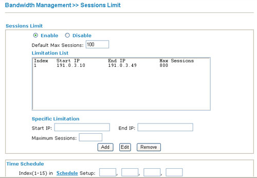 Session Limit ที่ Vigor 2950 สามารถยับยั้งของเขตความเสียหายของระบบอันเนื่องมาจาก Virus หรือ Trojan ในระบบได้ เช่นหากภายในระบบเครือข่ายมีเครื่องลูกข่ายติดไวรัส และไวรัสสายพันธุ์นั้น Broadcast Package ไปที่ Gateway เป็นปริมาณมากๆ ฟังก์ชั่นนี้ก็จะช่วยจำกัดขอบเขตความเสียหายของระบบขึ้นได้ โดยปกติแล้ว Session ที่ใช้ในเครื่องคอมพิวเตอร์แต่ละเครื่อง ควรกำหนดไม่ต่ำกว่า 100 Sessions อีกทั้งฟังก์ชั่นนี้ยังสามารถกำหนดช่วงเวลาการทำงานได้เช่นกัน
