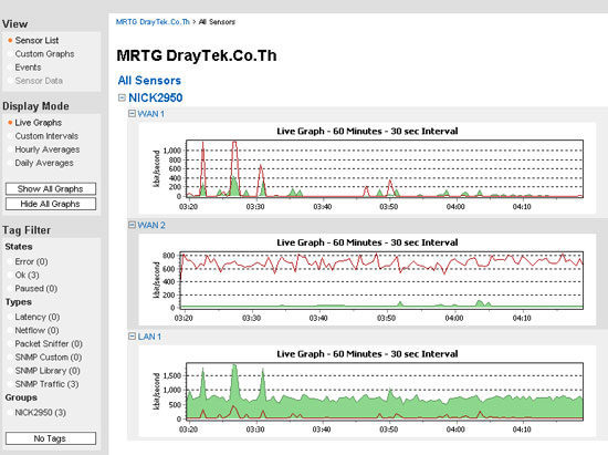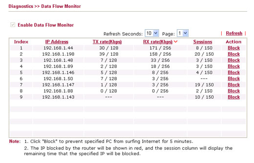 ไม่มี Router ยี่ห้อไหนที่ให้คุณได้มากเท่านี้อีกแล้ว Vigor 2950 สามารถวิเคราะห์ให้คุณได้ว่า IP ไหนสร้างปัญหาให้กับเครือข่ายของคุณ จากภาพคุณจะสามารถเห็นได้ว่า IP ไหนใช้ Session ไปแล้วเท่าไหร่ และใช้ Speed ในการ Download และ Upload เท่าไหร่ ซึ่งหาก IP ไหนสร้างปัญหาหรือใช้ Session มากนักคุณก็สามารถสั่ง Block มันไว้สักพักก็ยังได้ (5 นาที) อีกทั้งยังมี MRTG ที่ตัวอุปกรณ์อีกด้วย เพื่อวิเคราะห์ปริมาณการใช้งาน Bandwidth ได้อย่างแม่นยำ