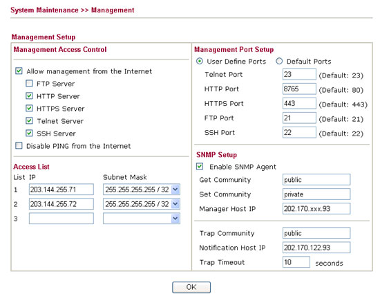 โดยปกติแล้วอุปกรณ์ประเภท Router ในปัจจุบัน จะสามารถ Remote และควบคุมการทำงานจากภายนอกได้ แต่หากท่านต้องการกำหนด Security สูงสุด ในการควบคุมอุปกรณ์จากภายนอก ท่านสามารถกำหนด Fix IP (Public IP) ที่จะเข้ามา Remote Router ตัวนี้ได้จากภายนอก หรือหากท่านมี Admin หลายคนที่ต้องทำงานร่วมกัน ท่านอาจตั้ง Proxy ไว้ 1 เครื่อง เพื่อทำ Authentication ในการเข้าควบคุม Router ในแต่ละครั้งก็ได้ ..... ในฟังก์ชั่น Management นี้ ท่านสามารถส่งค่า SNMP ไปยัง MRTG Server ของท่านได้อีกด้วย