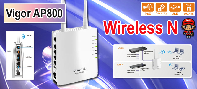 Vigor AP800 Wireless N ผลิตภัณฑ์ที่ใช้งานแทนรุ่น Vigor AP800 Vigor AP800 เป็น Wireless มาตรฐาน N แท้ๆ ซึ่งสามารถ Transfer ข้อมูลได้สูงสุดถึง 300 Mbps โดยหากต้องการส่งสัญญาณข้อมูลให้ได้ไกลขึ้น ก็อาจใช้ USB Client ที่รองรับ Wireless N ด้วยก็ได้ ซึ่งจะทำให้กำลังส่งนั้น สามารถใช้งานได้ไกลขึ้นถึง 3 เท่า (300 เมตร) แต่จากการทดลองใช้งานในสถานการณ์จริงนั้น ถึงแม้ว่าภาครับจะไม่ใช้ Wireless N Adapter ก็ตาม ก็ยังสามารถรับสัญญาณได้ไกลกว่า Access Point ปกติถึง 100% เลยทีเดียว Corecasys เราให้บริการจัดจำหน่ายผลิตภัณฑ์ต่างจากผลิตภัณฑ์ยี่ห้ออื่นเป็นอย่างมาก เพราะเราขายอุปกรณ์พร้อมบริการหลังการขาย และความรู้ต่างๆ ที่คุณจำเป็นต้องใช้งานเกี่ยวกับอุปกรณ์ของเรา ด้วยความที่เราเป็นผู้พัฒนาระบบ (SI) เราจึงสามารถผลักดันคุณให้ใช้งานอุปกรณ์ได้จนจบความต้องการของคุณ โดยเฉพาะอย่างยิ่ง นโยบาย การให้ทดลองใช้งานผลิตภัณฑ์ยาวนานถึง 3 สัปดาห์ ยังเป็นข้อพิสูจนได้ว่า เมื่อคุณซื้ออุปกรณ์ไปแล้ว อุปกรณ์จะต้องช่วยงานคุณได้อย่างมีเสถียรภาพ ไม่ใช่เอาอุปกรณ์เข้าไปสร้างปัญหา และความวุ่นวายใจให้กับคุณ Technical Specifications of VigorAP 800 Wierless AP Mode AP Mode Station Infrastructure AP Bridge Point to Point AP Bridge Point to Multipoint WDS Universal Repeater IEEE 802.11 b/ g / n Compliant Wireless Client List 64 / 128-bit WEP WPA/WPA2 Multiple SSID Hidden SSID WPS WMM(Wi-Fi Multimedia) MAC Address Control Wireless Client Isolation Internal Radius Server * MAC Clone AP Client Security: TLS, PEAP* DHCP Server TR-069* VLAN Grouping and SSID Mapping for LAN A & B USB Printer Server* Network Management Web-based User Interface (HTTP) CLI (Command Line Interface,Telnet) Configuration Backup/Restore Firmware Upgrade via WUI Management Session Time Out Hardware Interface 5 x 10/100 Base-TX LAN Switch, RJ-45 (1 x PoE Port on LAN-A1 Port) 1 x USB 2.0 Host 2 x Detached Antennas 1 x Factory Reset Button 1 x Wireless ON / OFF / WPS Button 1 x Power ON / OFF Button