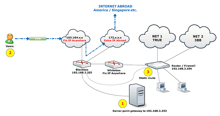 (2) สามารถแชร์ International Gateway (Extra IP Abroad) ผ่านระบบ VPN ได้ |
